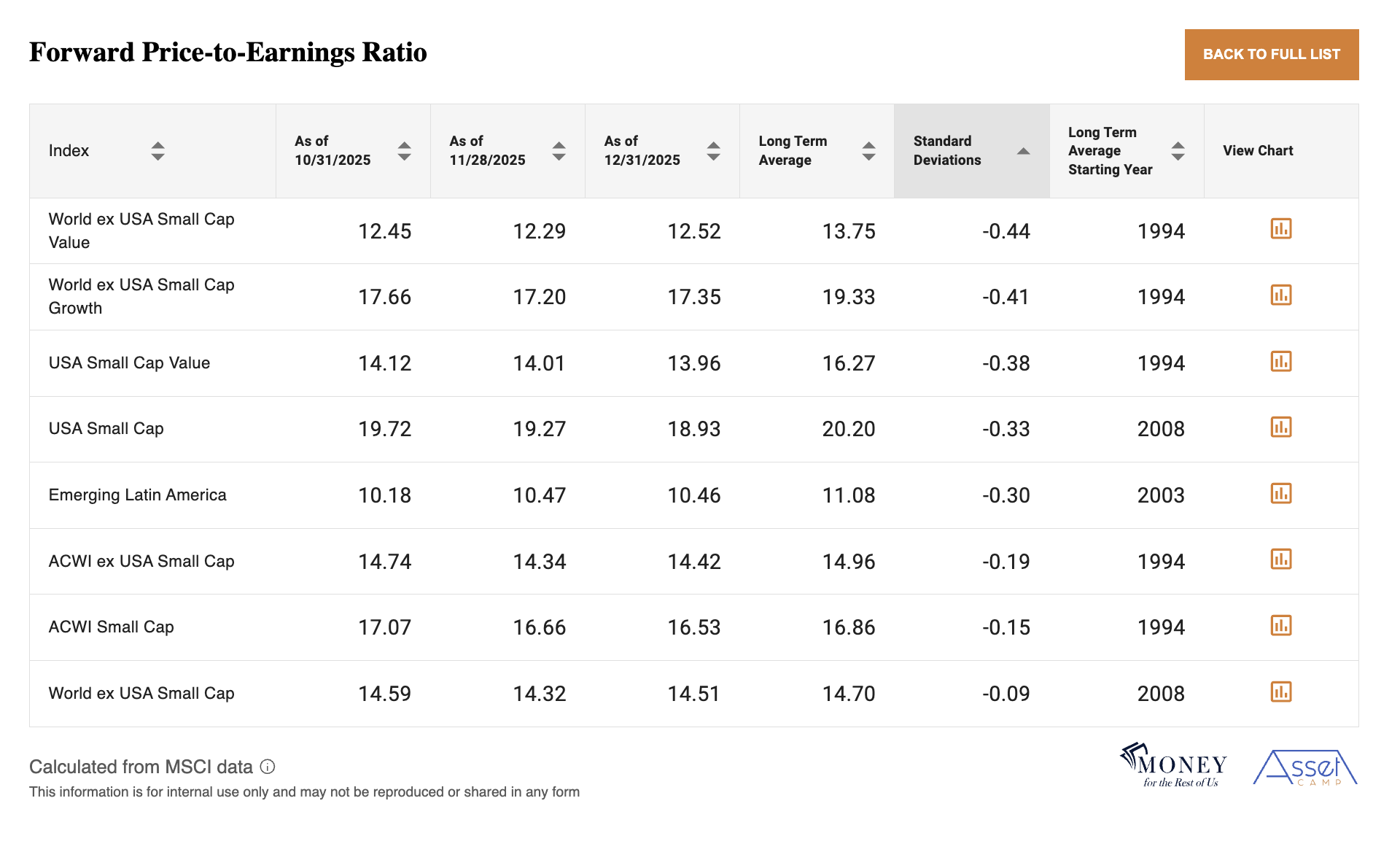 This table shows the least expensive stock markets around the world based on what investors are paying for expected earnings relative to the long-term average.